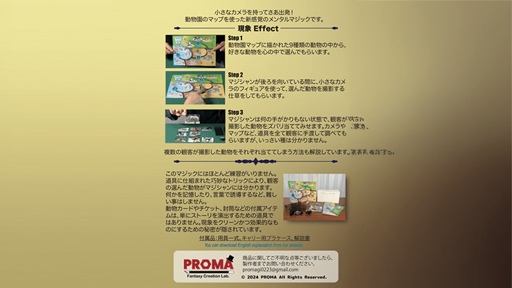 A new kind of mental magic performed using a zoo map. The magician guesses the animal that the audience has photographed with a miniature camera without any clues.