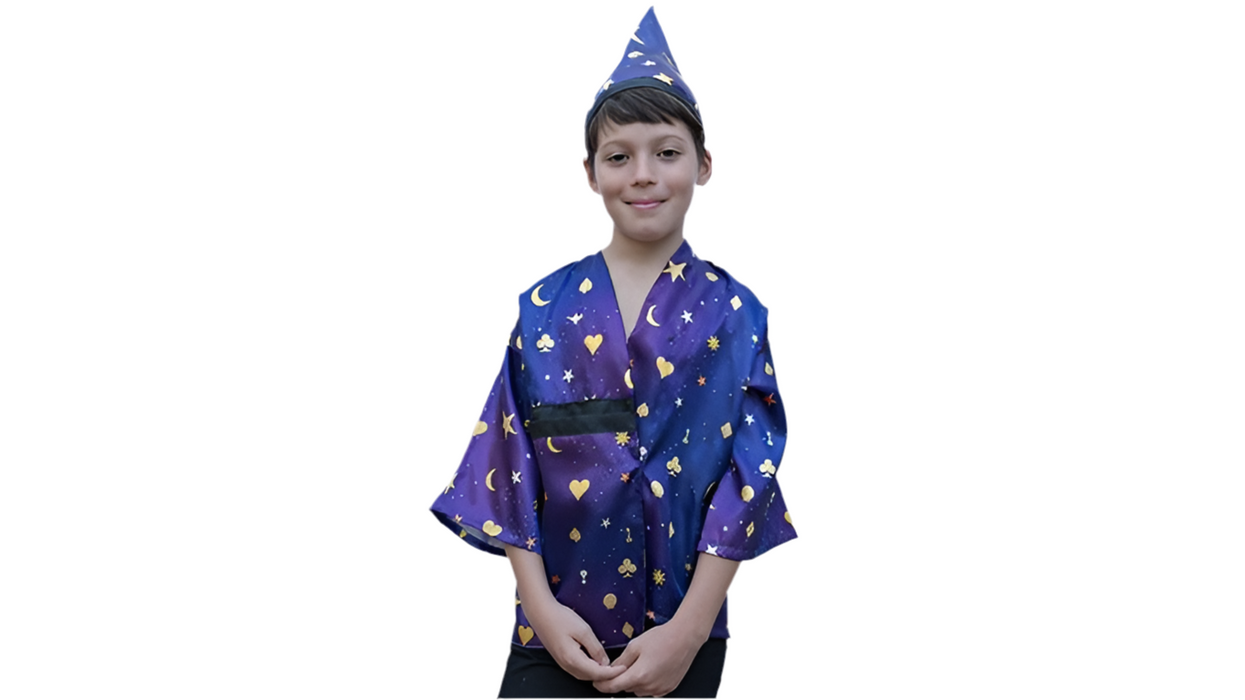A small bag is displayed to the audience. The magician shows the bag is empty, turning it inside out and allowing a member of the audience to feel the inside. A silk handkerchief is dropped into the bag and a child from the audience is asked to wave his hand over the bag making the handkerchief vanish. Try as he might, the child just can't make the handkerchief disappear... but he does end up making the handkerchief turn into a magician hat! In a flash, the entire bag is then turned into a magician costume that matches the hat and fits your helper perfectly!