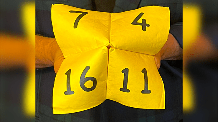 "OK. Well, that was magic. Let's see what SCIENCE has to say." Performer reaches in his pocket and take out a large envelope labeled "SCIENCE." He then opens the envelope and removes ...A GIANT COOTIE CATCHER. This is a guaranteed strong laugh with a wave of childhood nostalgia.