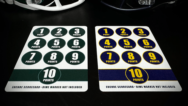 The semi-custom Courts incorporate color accents from their matching back cards. The face cards are extremely functional and provide the highest level of playability. Also included are two rules cards and four custom score cards. You just need a dime as your points marker. No need for boring fives as makeshift score cards in the MICHIGAN Euchre Deck!